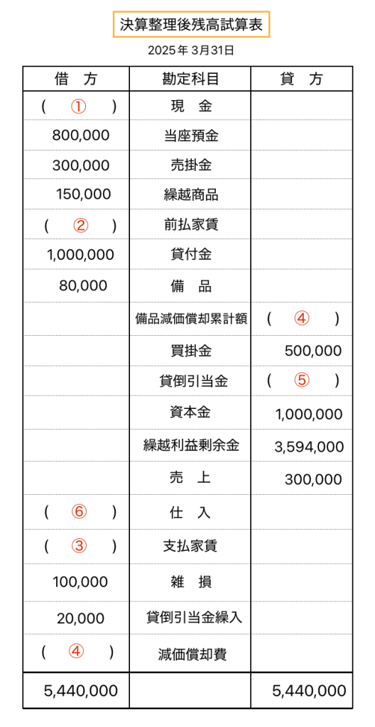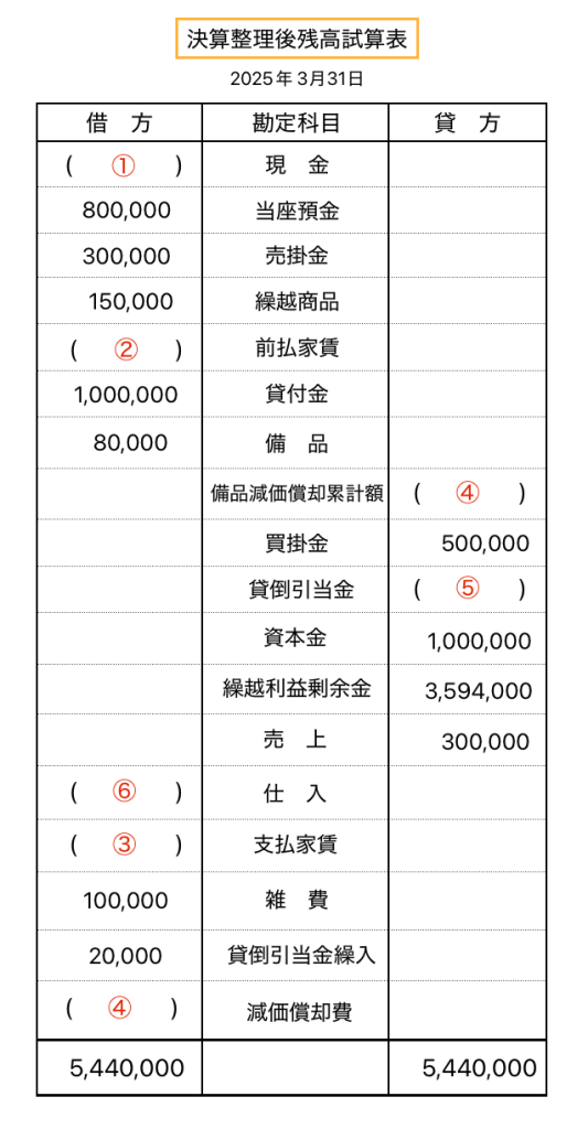 先ほど解いた仕訳を参考に空欄 ①〜⑥を埋めてください。