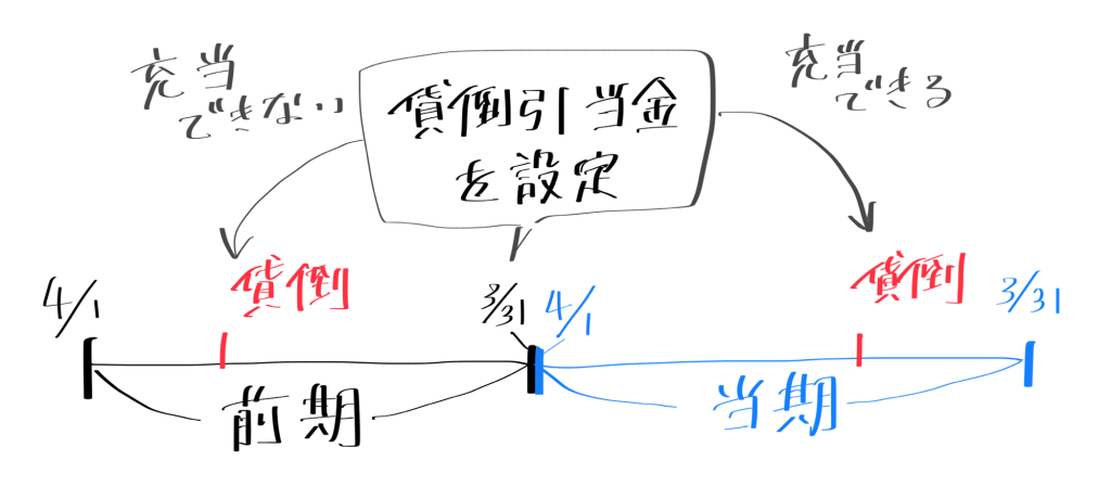 先ほどまでの例題は基本的な理解を目的として時系列を無視したものでしたが、実際の引当金の設定にはその前後の仕訳を考慮する必要があります。特に、貸倒れに対して引当金が充当できるのは、前期までに引当金が設定されている場合のみという明確なルールがありますから問題を解く際はその点を必ず意識してください。