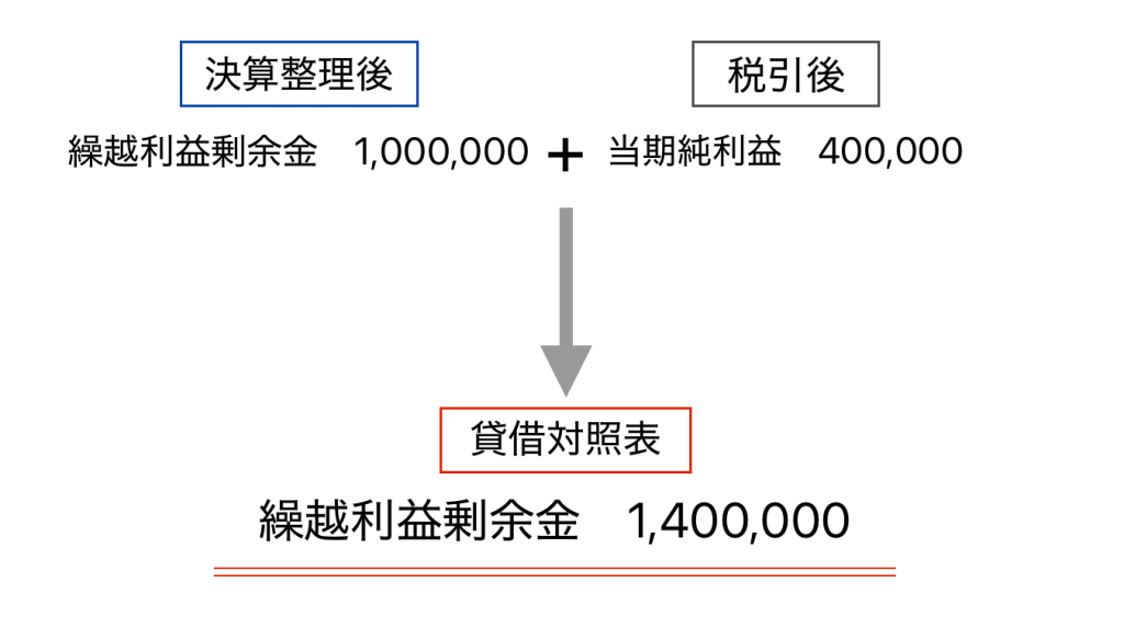 ここでの繰越利益剰余金は1,400,000円ですから、決算整理後残高試算表で示されていた1,000,000円に、税引後当期純利益400,000円を加えているということになります。