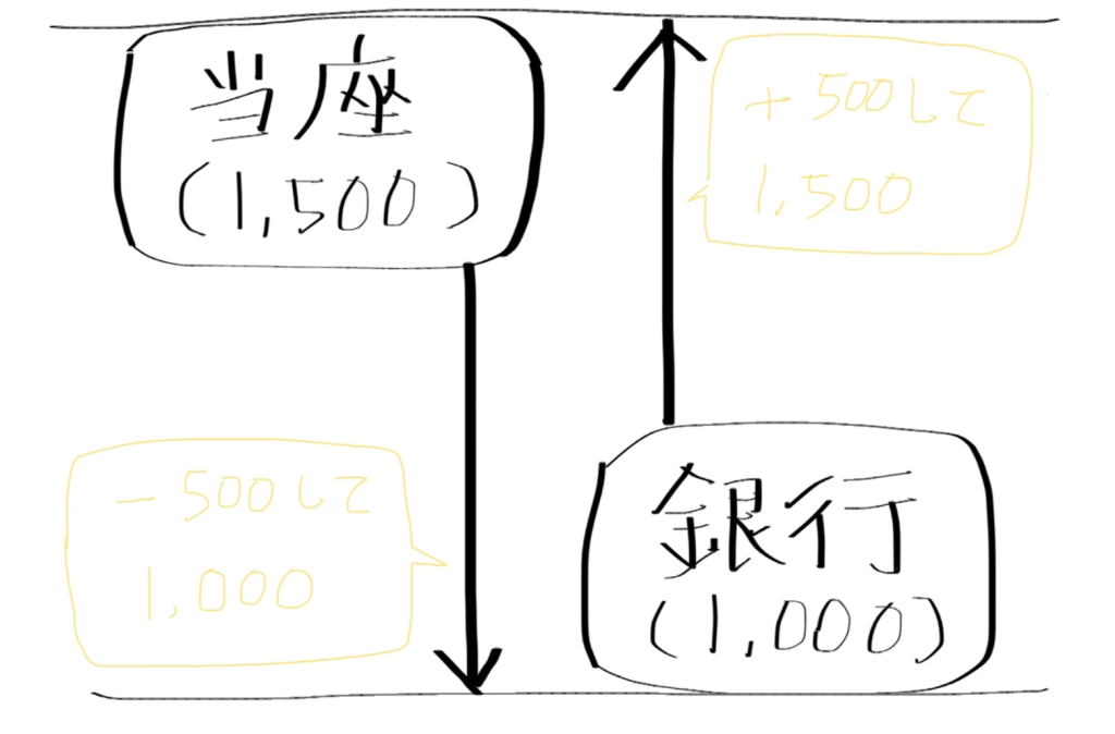 具体的には、当座預金を1,500円、銀行の預金残高を1,000円とすると差額は500円になりますよね。この500円のズレは何が原因で生じたのかを考えながら、都度、帳簿の当座預金残高を減少させるか残高証明書に記載されている残高を増加させて金額を一致させるというわけです。