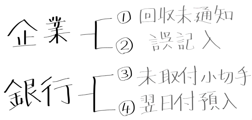 このとき、金額上のズレが認めらない場合は問題ないのですが、ズレがある場合にはその原因を認識しながら銀行勘定調整表を作る必要があります。