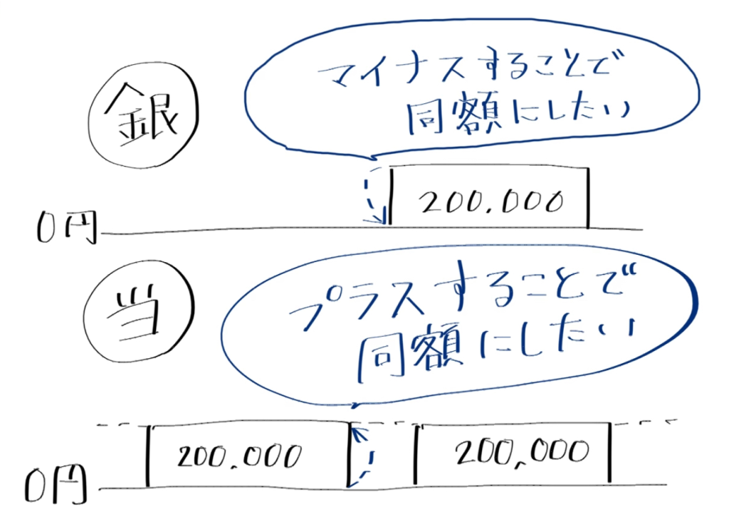 ここで急に銀行側の減算処理も出てきました。これは先ほどの歩み寄りのイメージのお話から考えると必然なのですが、金額の一致を目指すとなると当座預金残高と銀行残高は互いの残高の額を追いかけることになりますから一方が増えるともう一方が減るという性質を持つことになります。