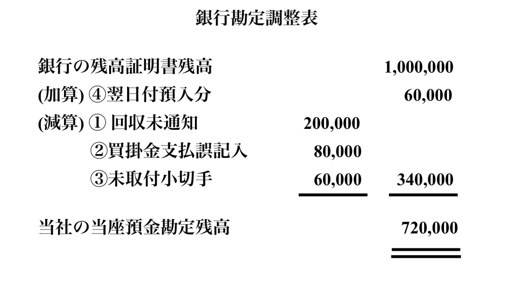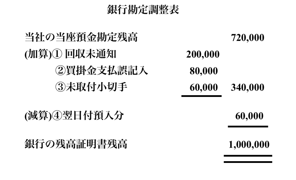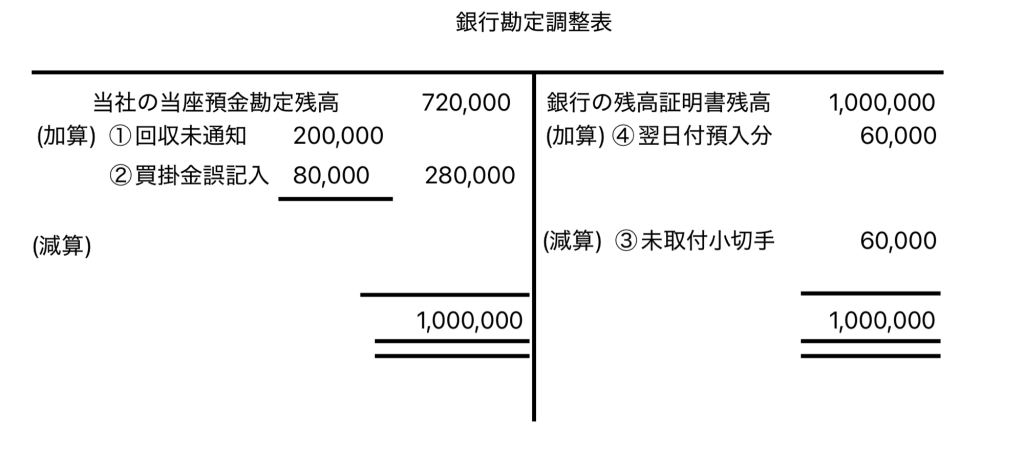 こちらは例文で問われていた①当座預金勘定の額を残高証明書の額に合わせて修正した銀行勘定調整表となります。加算、減算がそれぞれなされ当座預金残高である720,000円から二重線が引かれている銀行の残高証明書残高1,000,000円の額になっていることが確認できると思います。