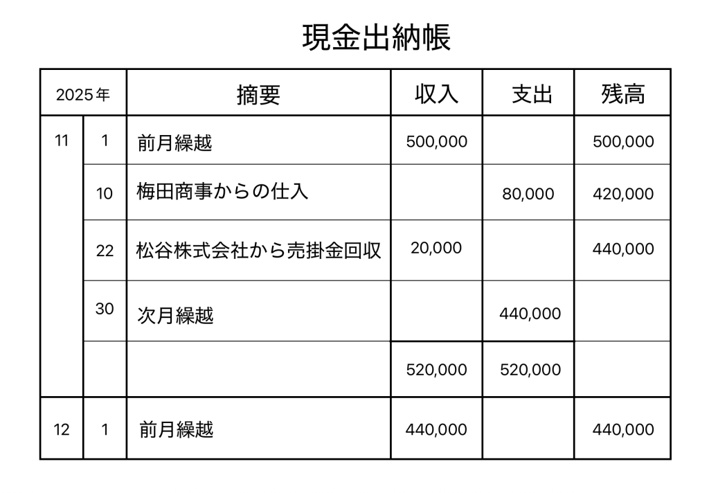 収入欄には、前月から繰り越した残高と現金勘定の増加が記帳されます。支出欄の金額は現金勘定の減少分ですね。