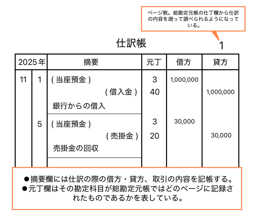 元丁欄の数字は総勘定元帳のどのページに記帳されている勘定科目であるかを示すものです。