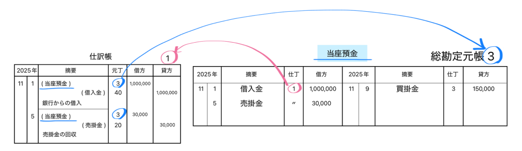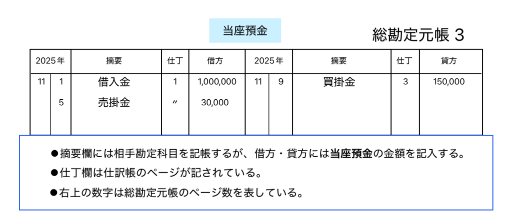 図の右上にある数字も総勘定元帳上で当座預金勘定がどのページに記帳されているかを示すものです。