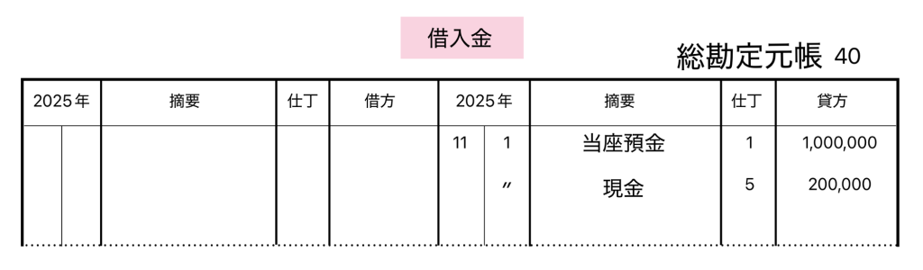 左側上の摘要欄にある借入金を例にすると、11/ 1 に発生したこの仕訳を転記しているということになります。