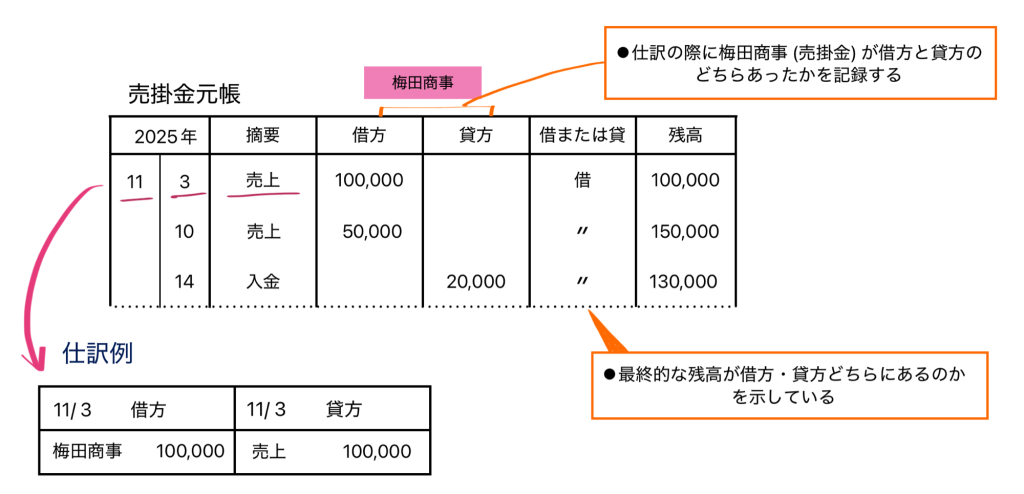 取引先である梅田商事に対する売掛金元帳を見てみましょう。
