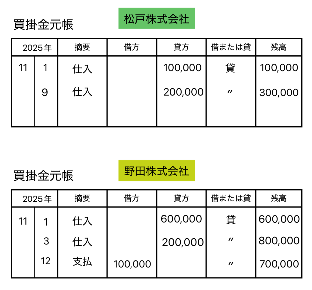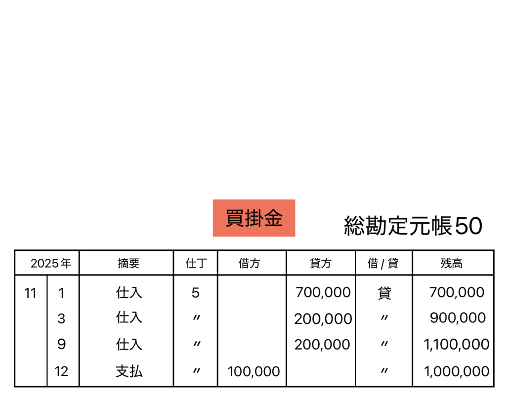 そうそう、実は総勘定元帳の記帳方法は2種類あり、先ほどのものを標準式、上のものを残高式といいます。こちらでは買掛金元帳と比較したかったので残高式を採用してみました。