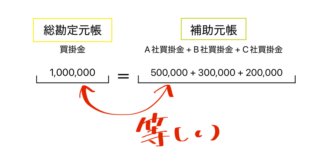 統制勘定の性質上、補助簿で集計された合計残高と総勘定元帳上の合計残高は必ず一致しなければなりません。